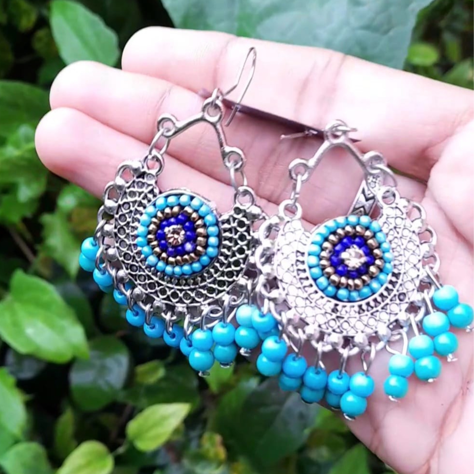 Make a bold statement with these handmade Chandbali-style earrings, designed to blend traditional elegance with bohemian flair. Each earring features a scalloped silver-toned frame filled with delicate filigree, centered by concentric rings of blue, bronze, and turquoise beads. Ten vibrant turquoise beads dangle from the base, adding movement and color to every turn.