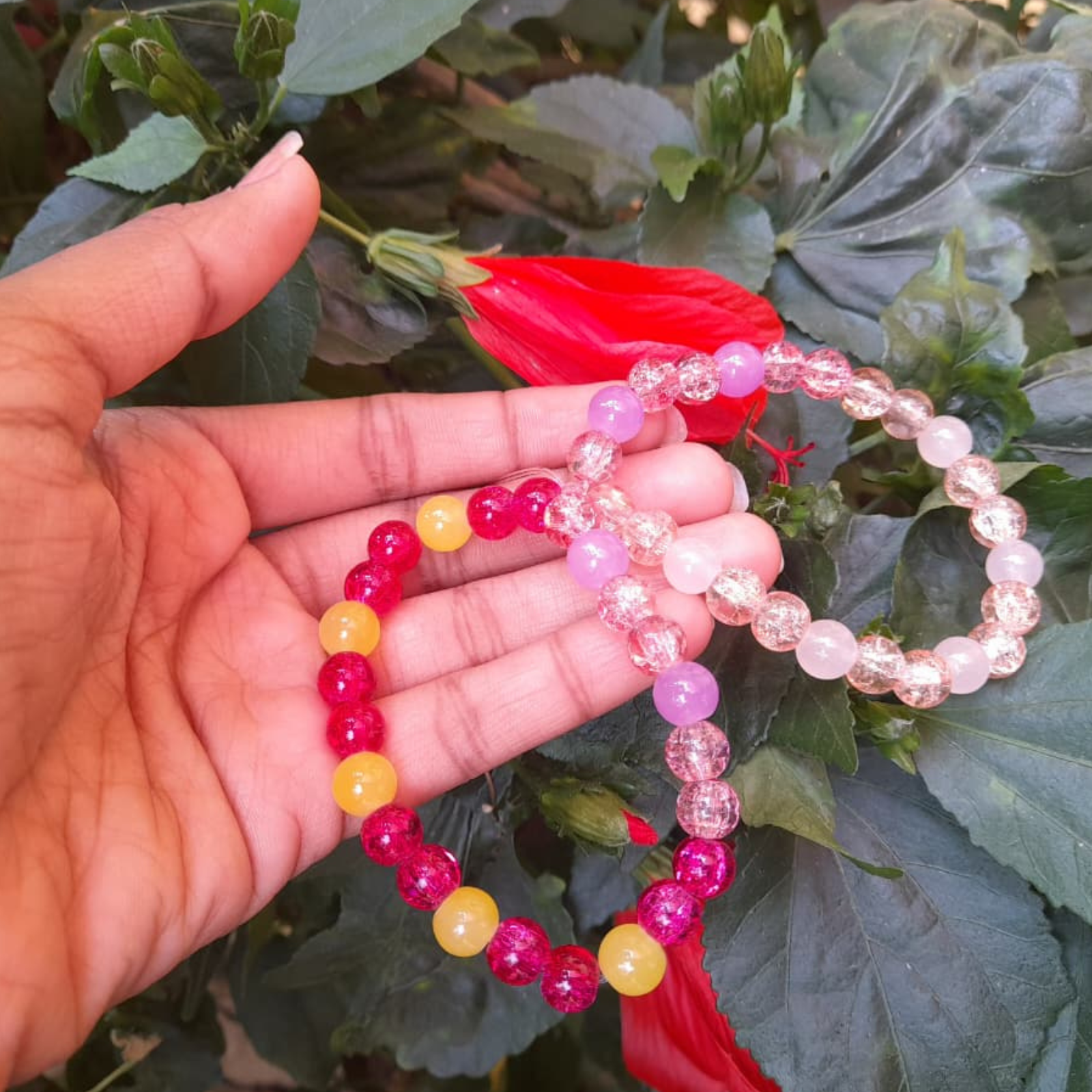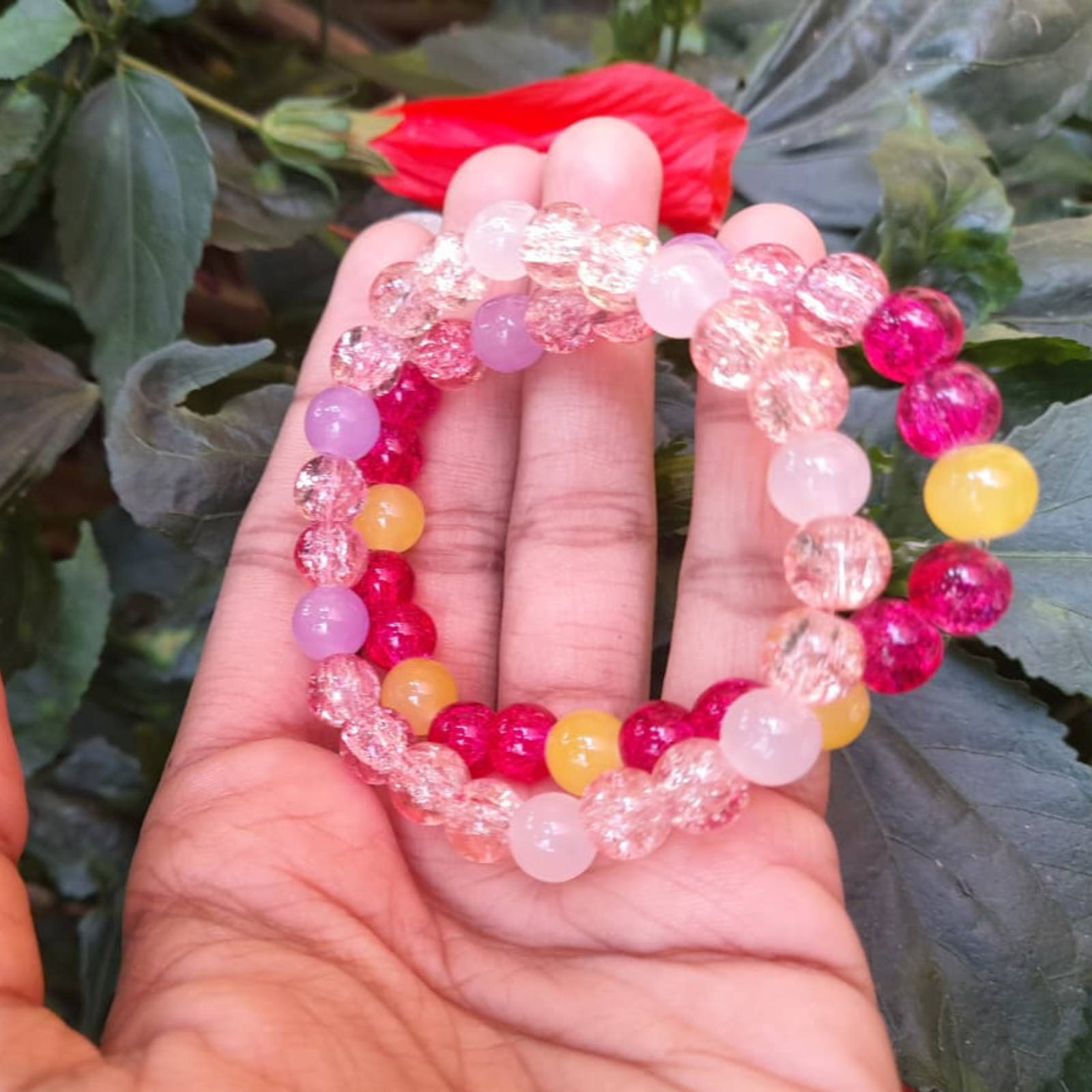 This fashionable double‑layered bracelet features two strands of glossy beads in vibrant shades of pink, purple, yellow, red, and clear. The layered design adds depth and style, making it a standout accessory for any occasion. Handmade with care, it’s perfect for stacking with other jewelry or wearing alone as a statement piece. Whether for parties, casual outings, or festive celebrations, this bracelet is a versatile addition to your collection and a must‑have for women who love colorful handmade accessories.