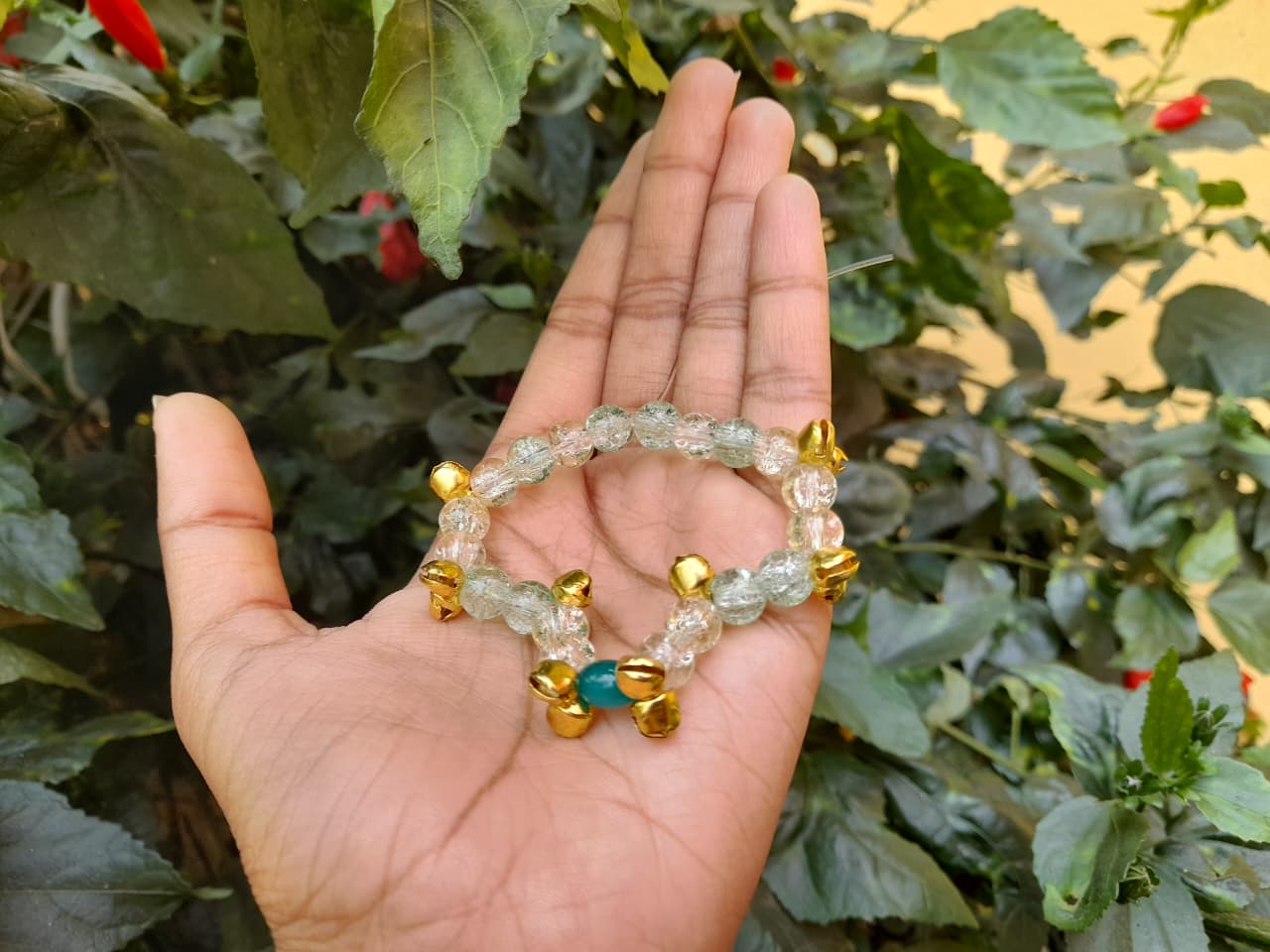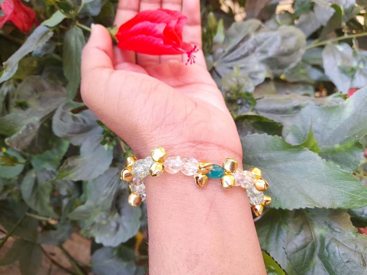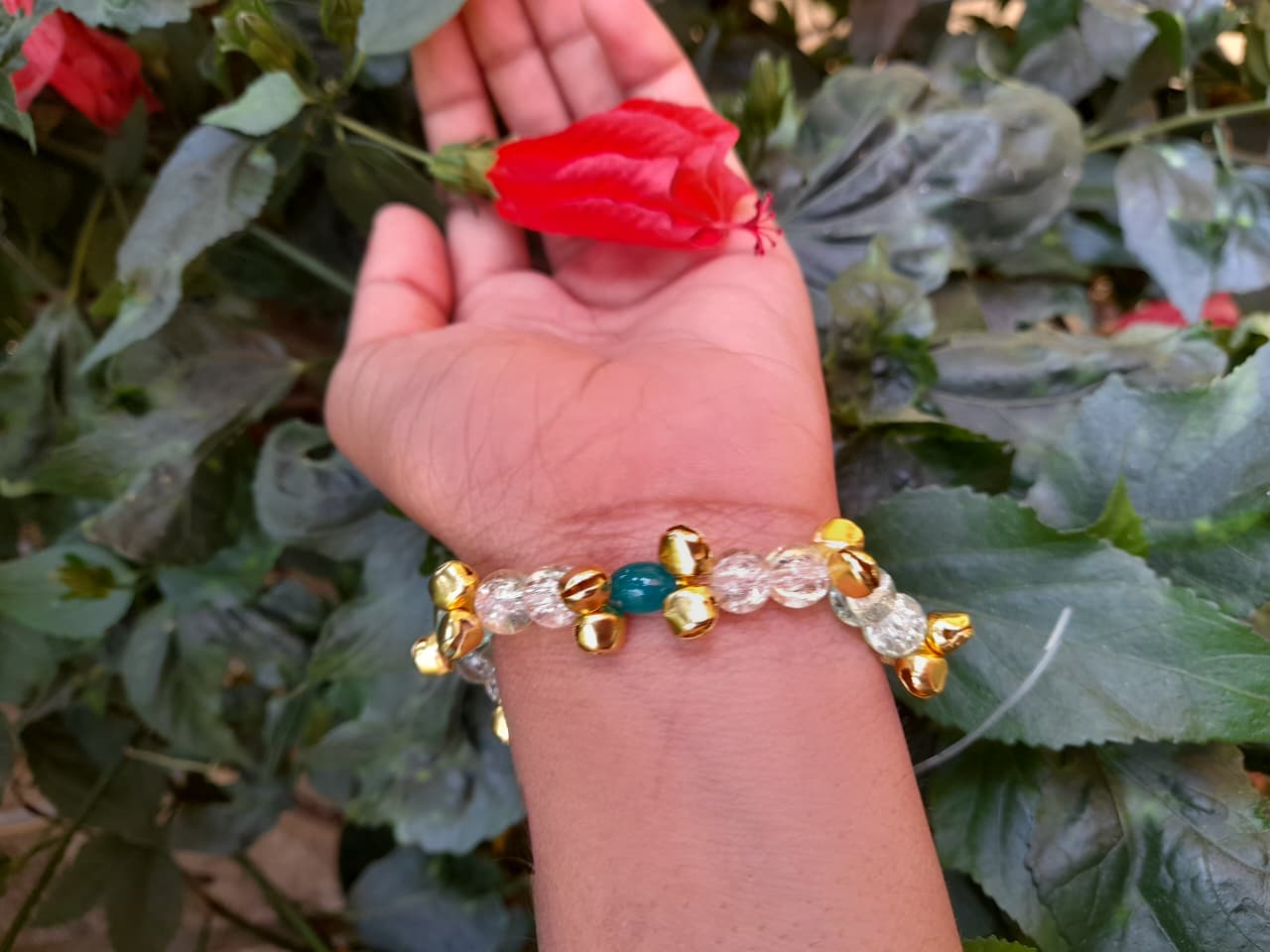 This elegant bracelet is crafted with transparent beads, golden accents, and a striking green centerpiece bead. The design is enhanced with tiny ghungroo bells, giving it a festive and traditional touch. Perfect for pairing with ethnic outfits or adding a unique charm to casual wear, this bracelet blends modern style with cultural heritage. Lightweight, durable, and eye‑catching, it’s an ideal accessory for women who love handcrafted jewelry with a golden‑green flair.