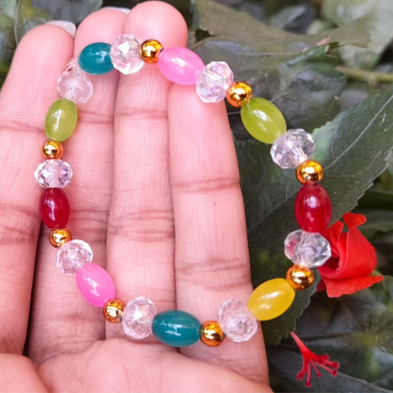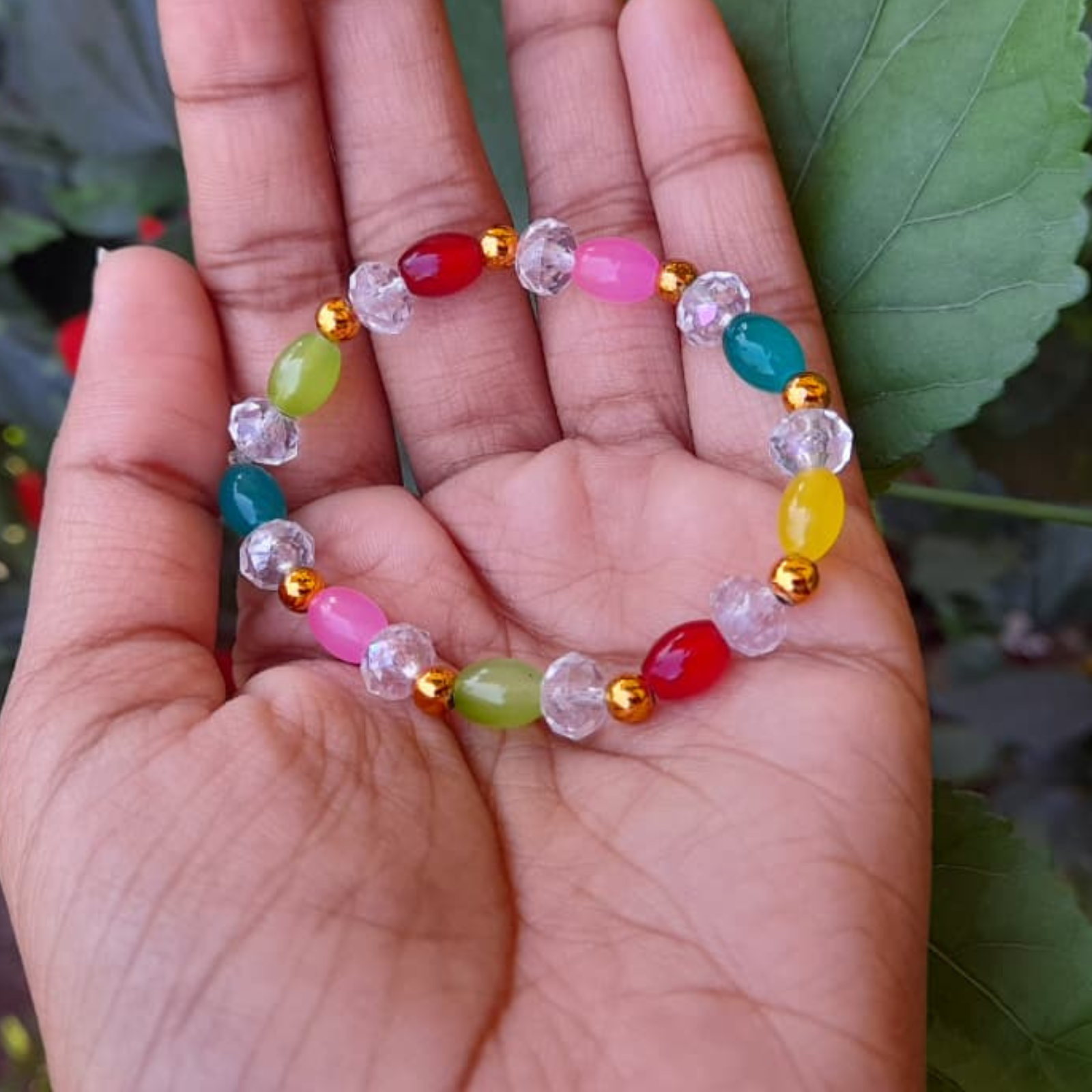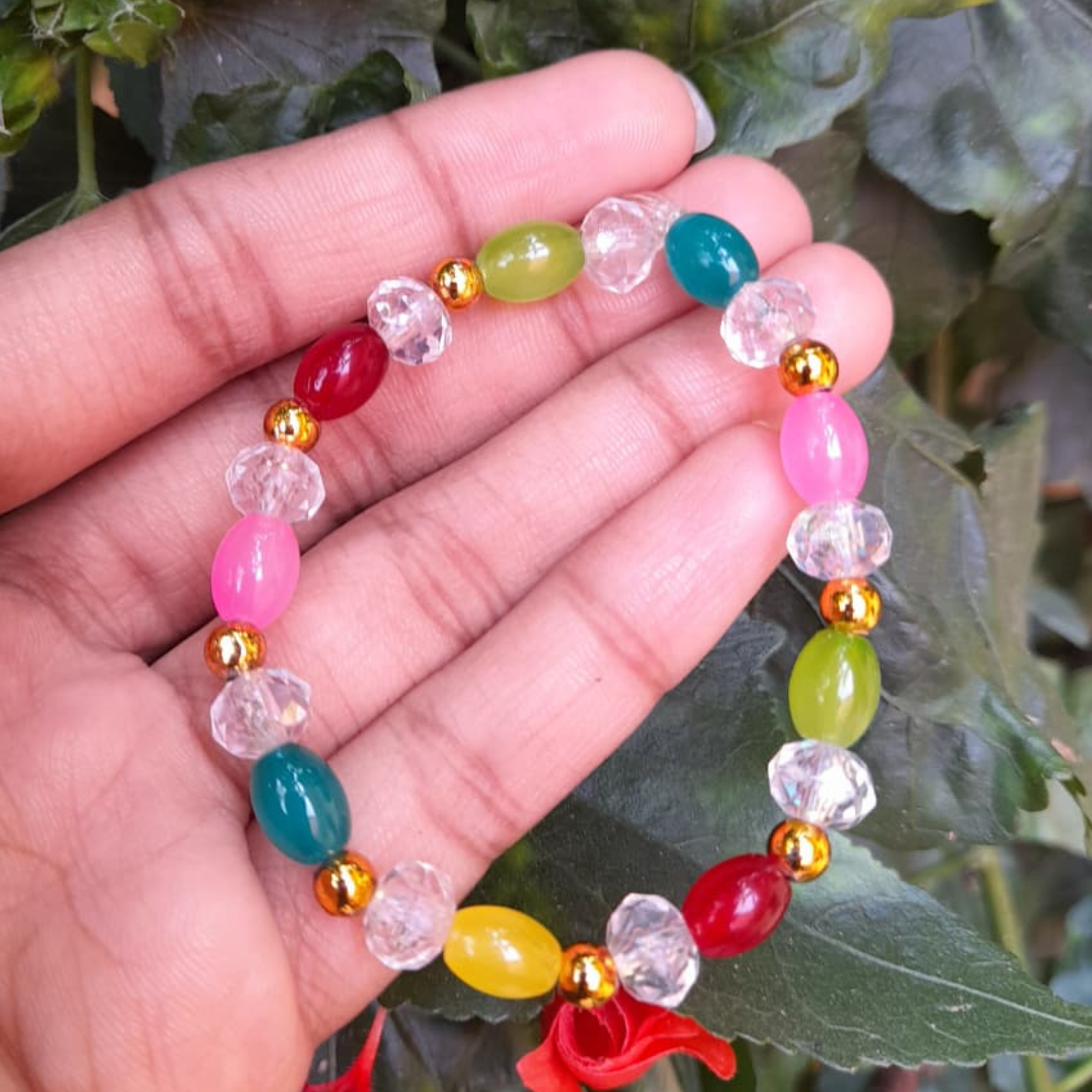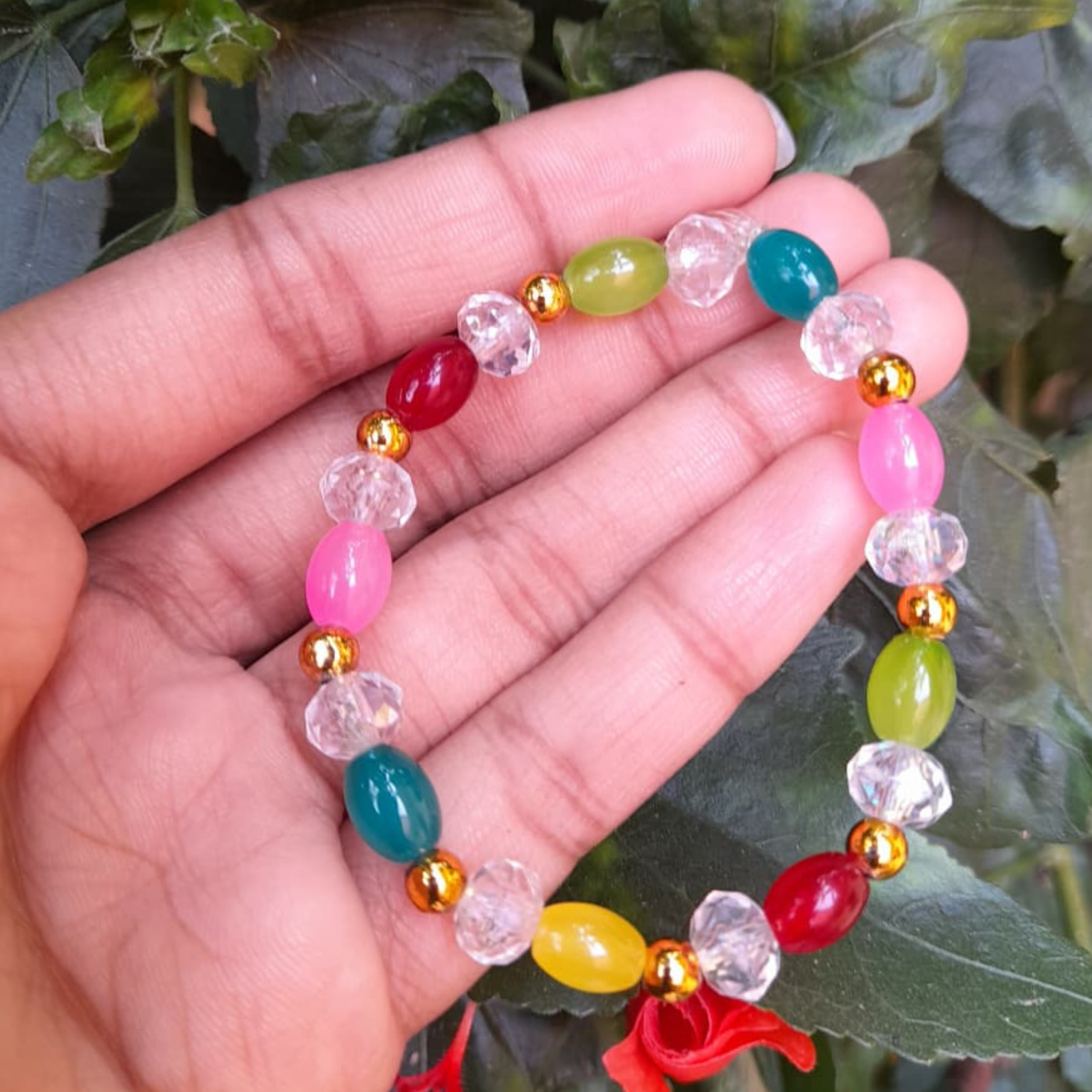 This bracelet features oval beads in striking shades of red, pink, green, yellow, and teal, paired with clear faceted beads and golden spacers. The combination of bold colors and metallic accents makes it a fashionable accessory for festive wear. Handmade with precision, it’s perfect for women who love statement jewelry.