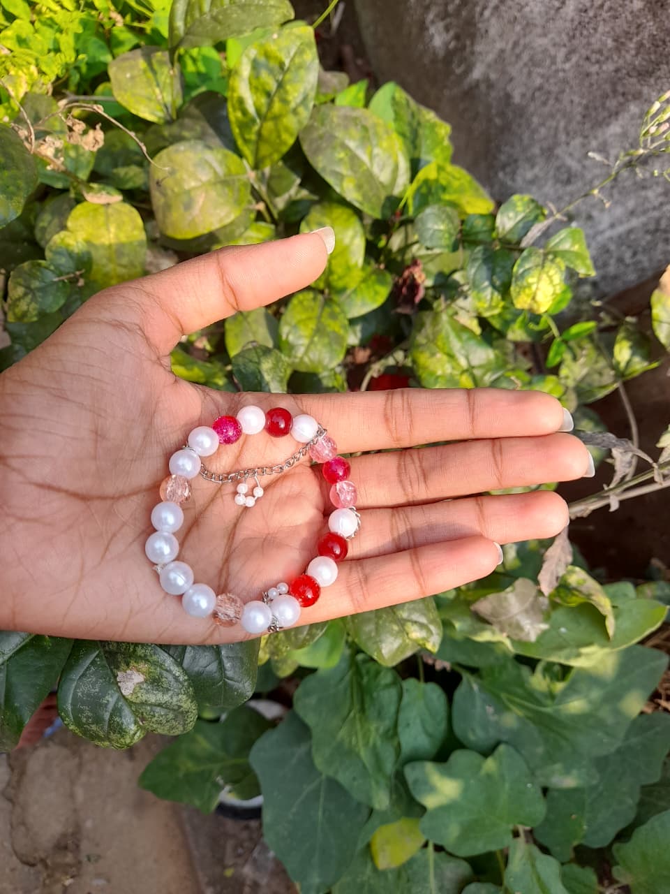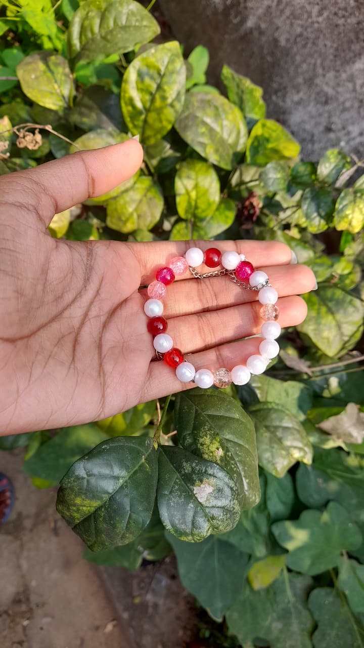 This handcrafted beaded bracelet features a stunning mix of pearl‑white, translucent pink, and bold red beads, connected with a delicate chain for durability. Perfect for casual wear or gifting, it blends timeless elegance with modern fashion. Lightweight and versatile, this bracelet adds a pop of color to any outfit, making it a must‑have accessory for women who love stylish handmade jewelry.